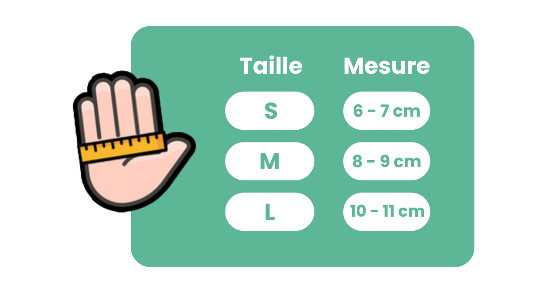 Référez-vous au tableau des tailles sur la page produit. Le gant doit être bien ajusté sans couper la circulation ; un léger soutien est recherché, pas une compression trop forte.